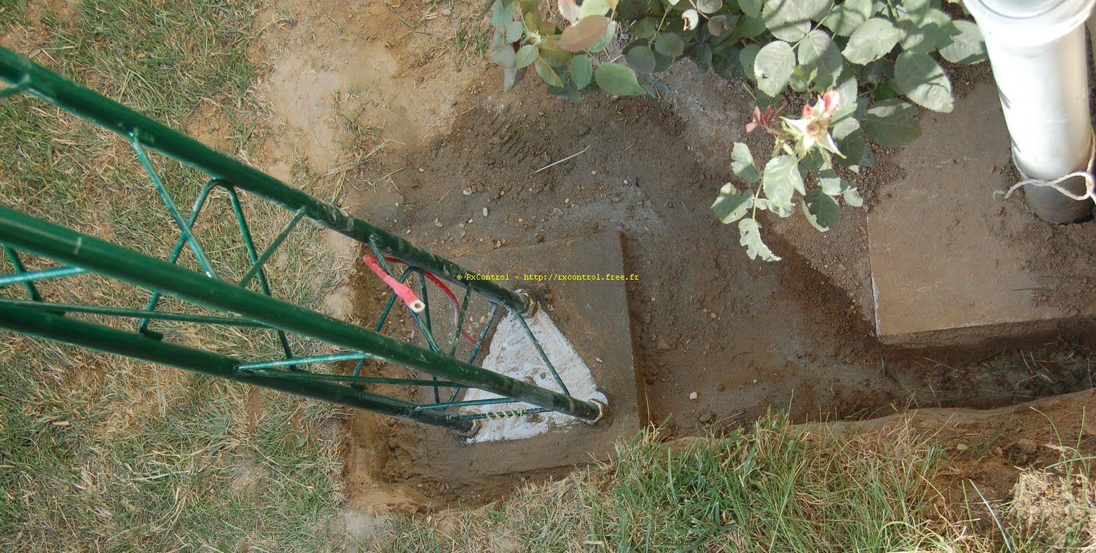 L'ensemble est rigidifié par du fer à béton soudé sur les tiges. L'ensemble sera noyé dans un socle de béton, le pylône étant maintenu au 3/5 de la hauteur par une potence fixée sur le mur de la maison. Je vais maintenant m'attaquer à creuser le socle, ce qui ne sera pas une mince affaire en cette période, la terre étant dure comme du béton.